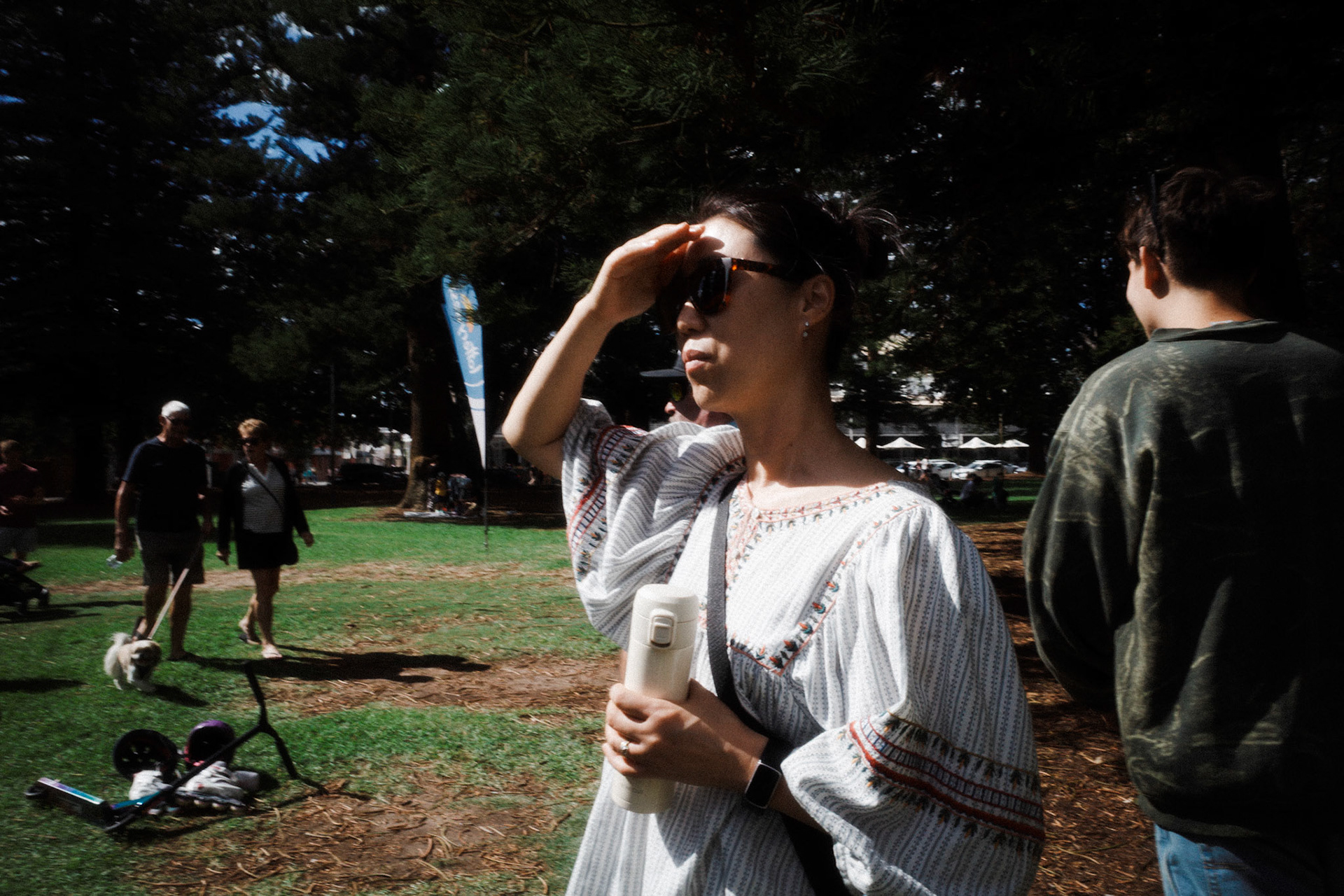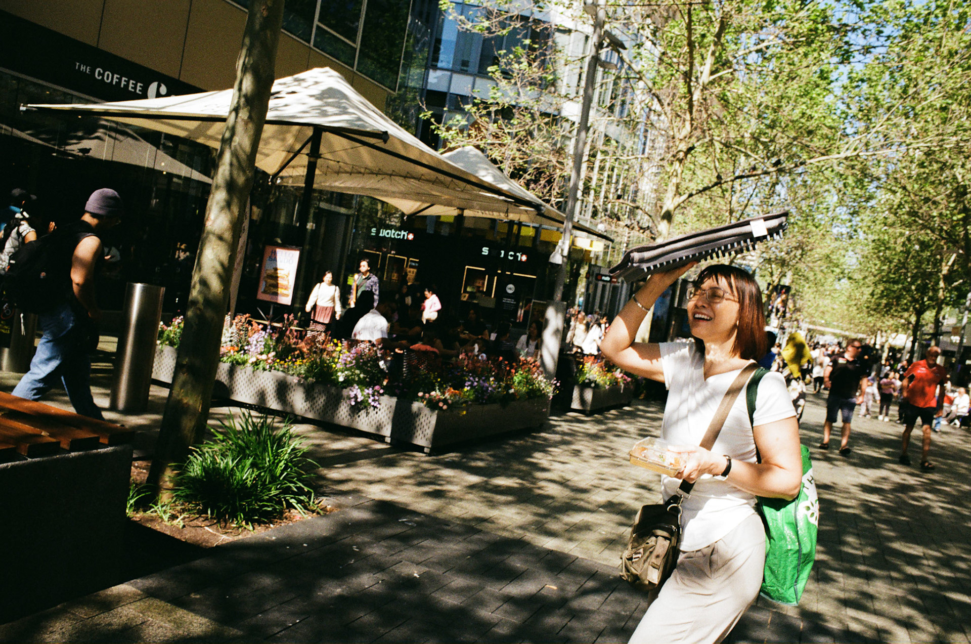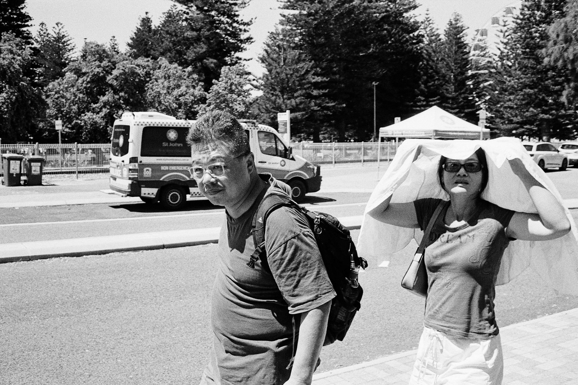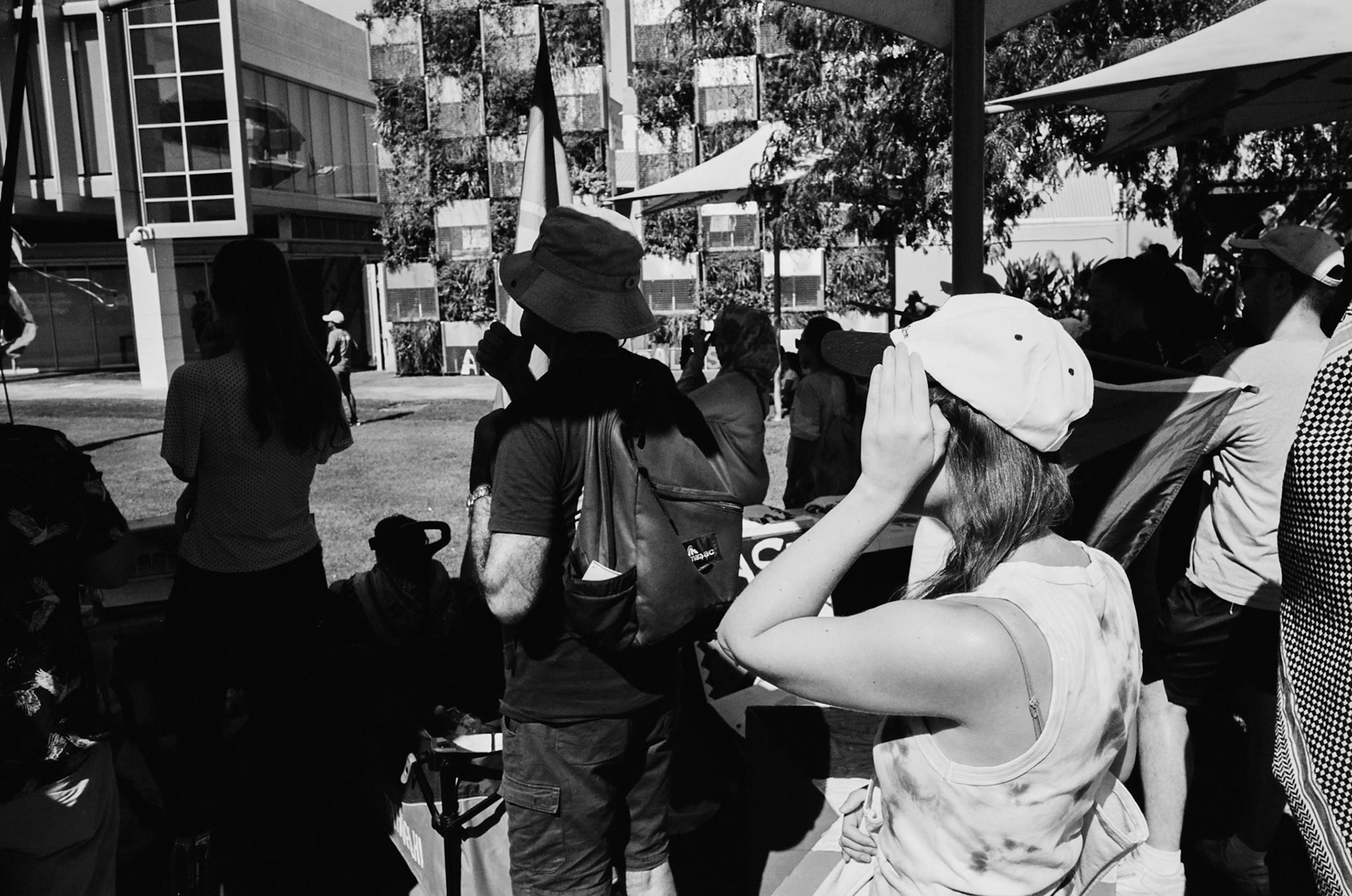 Scenes of people caught in the sun, using anything but a hat.